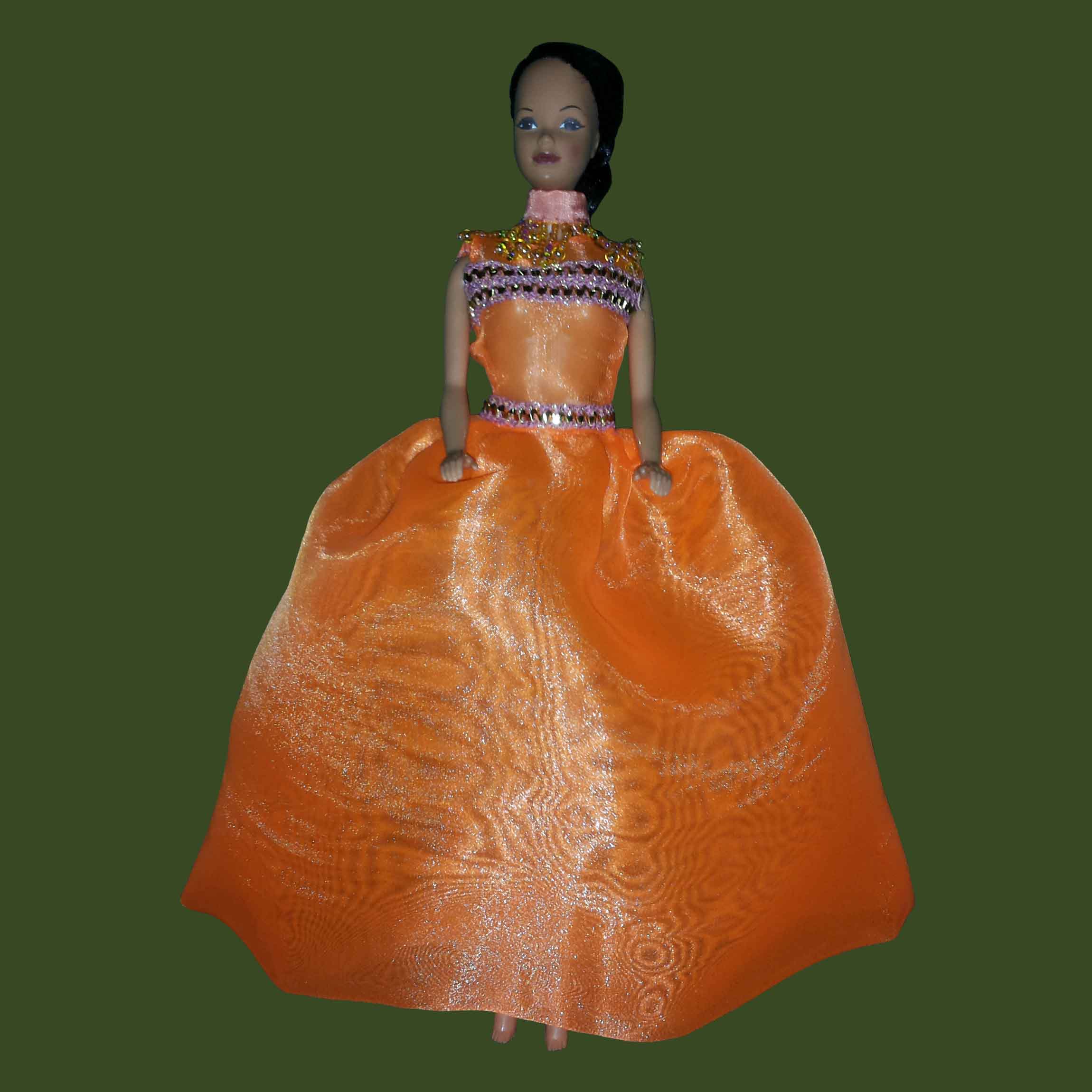 Vestido largo en organza color naranja con apliques en la parte superior.