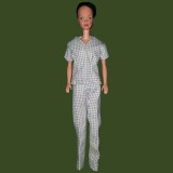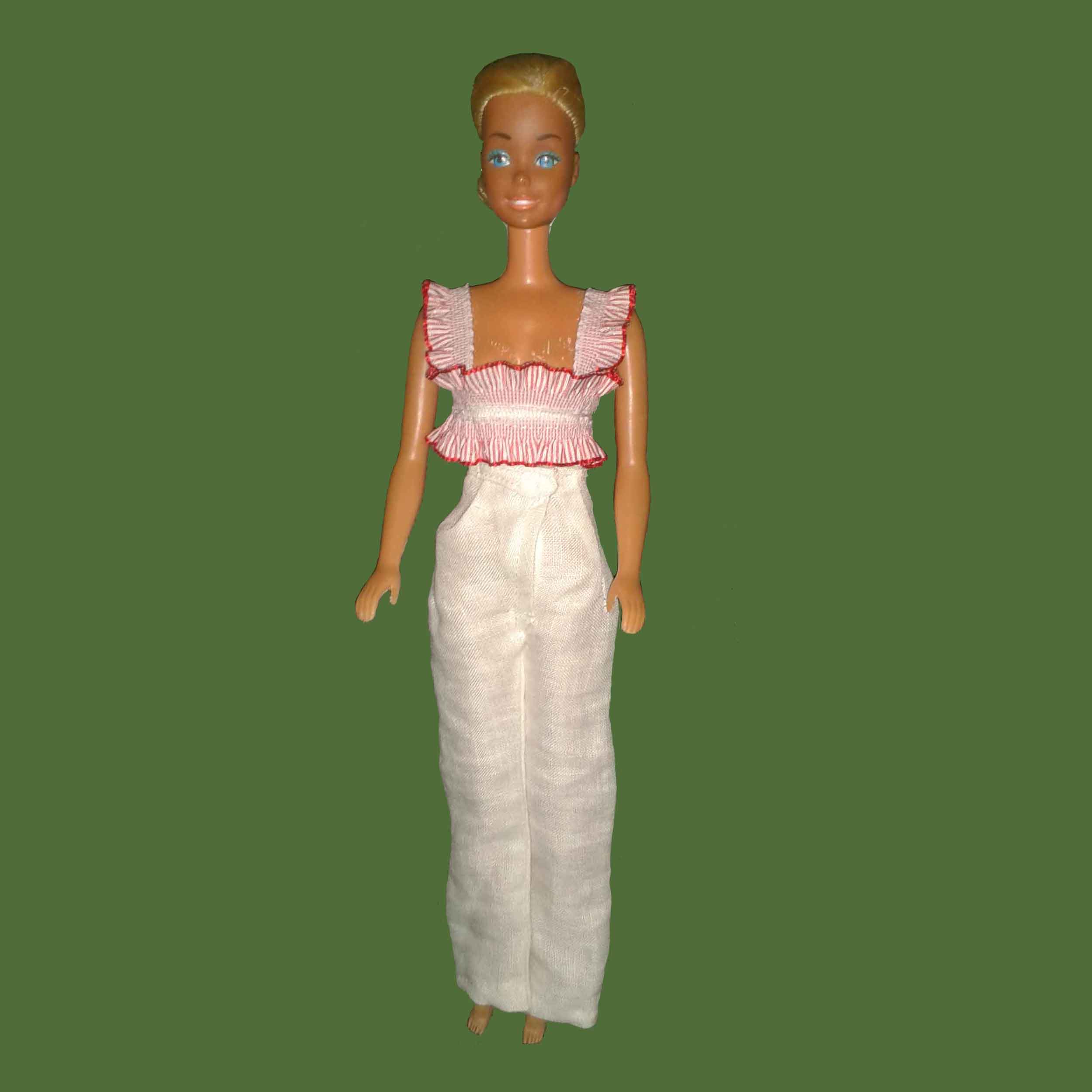 Ref.: BTP-2014-0002. Traje pantalón en hilo de color blanco con top a rayas rojas.