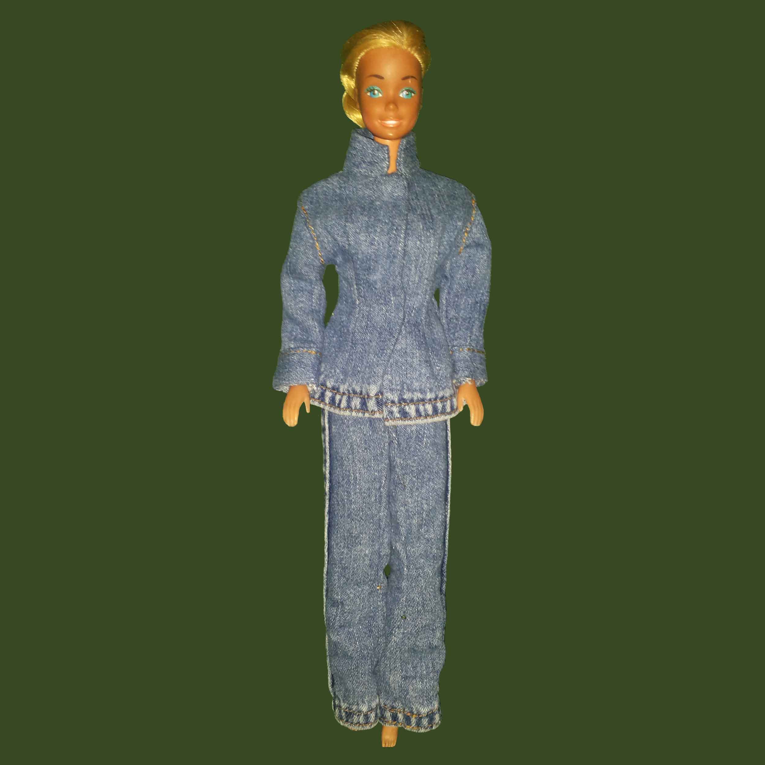 Ref.: BTP-2014-0007. Traje de pantalón vaquero azul con su correspondiente chaqueta de cuello alto.