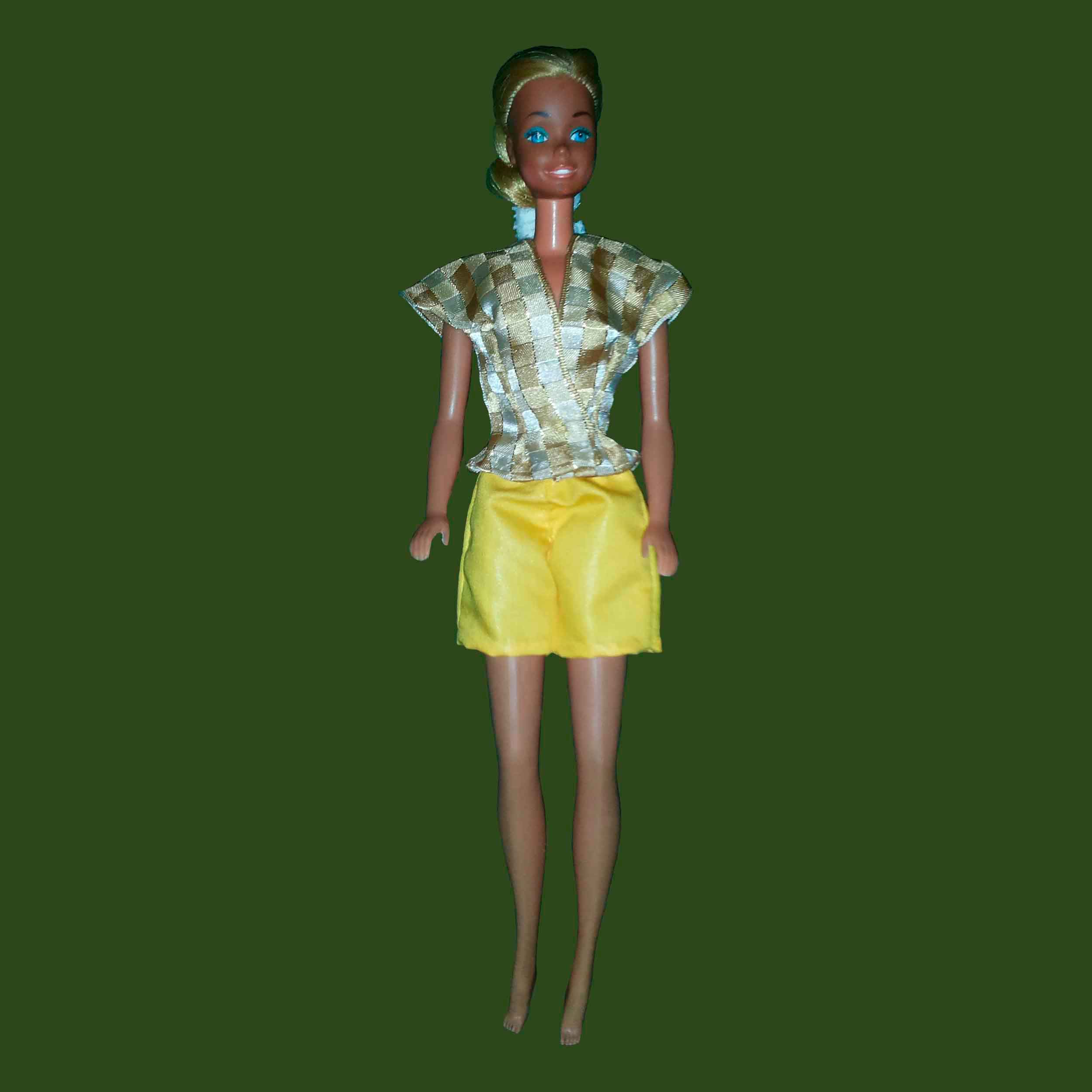 Traje de pantalón corto amarillo con blusa de raso dorada a cuadros.