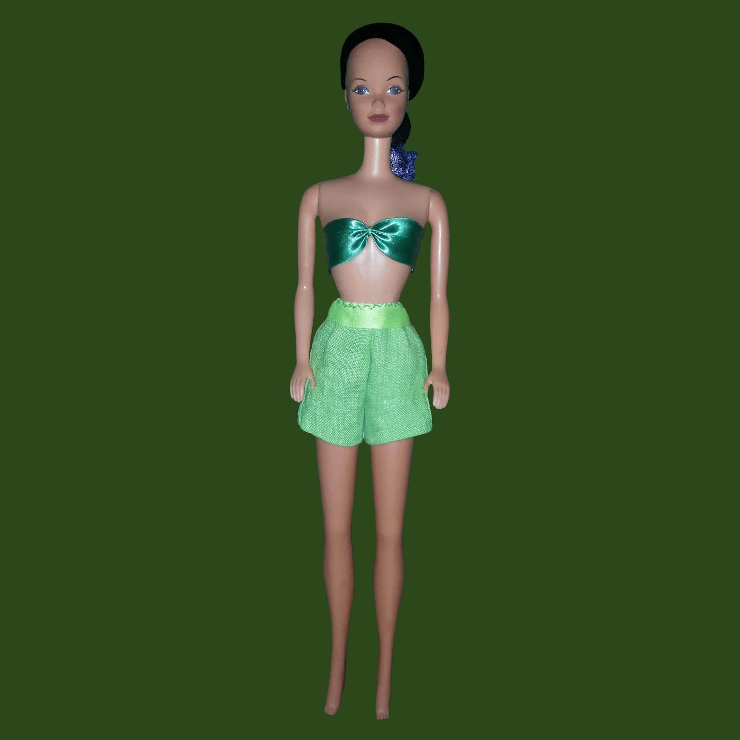 Traje de pantalón en raso e hilo de dos piezas en dos tonalidades de verde.