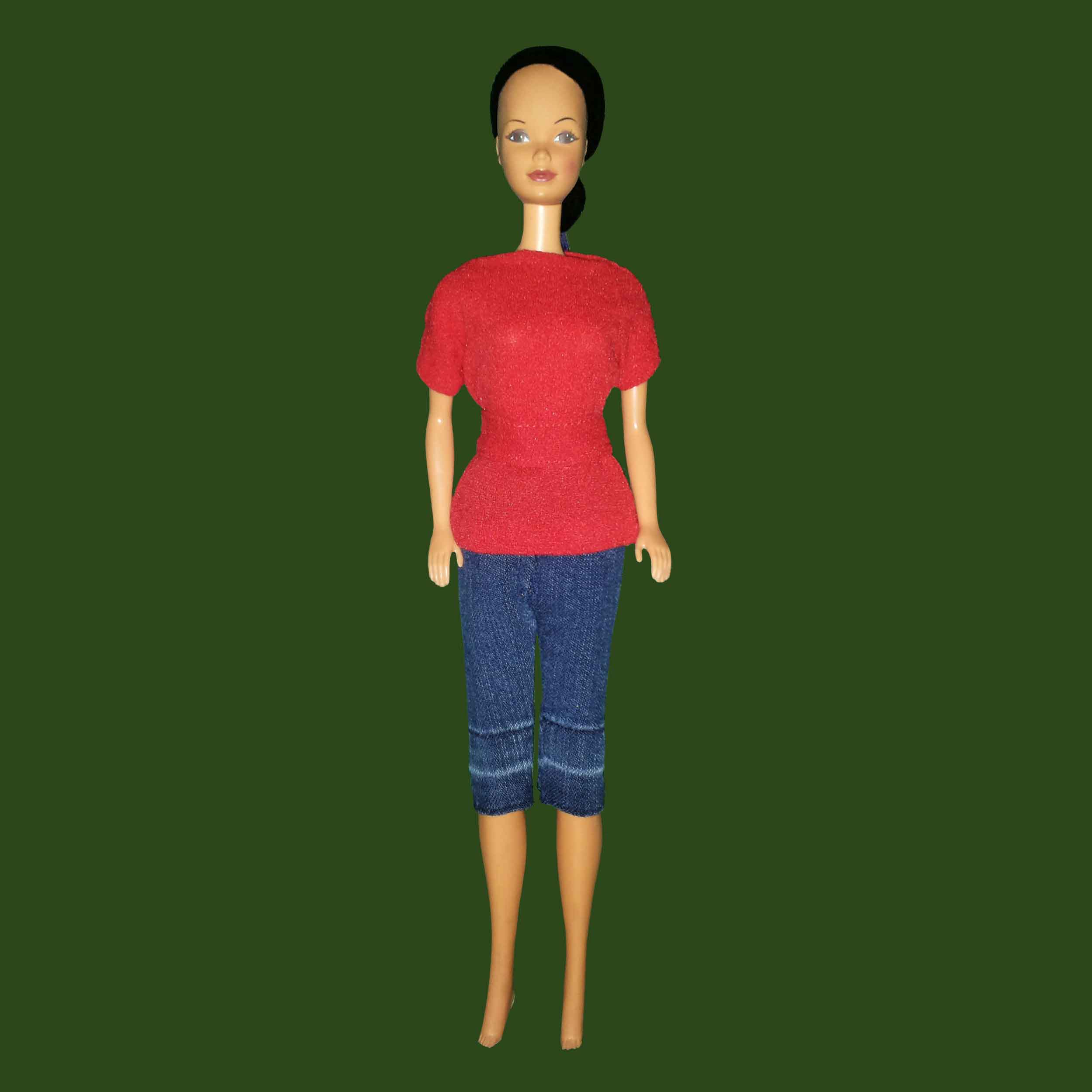 Ref.: BTP-2015-0005. Conjunto de dos piezas con pantalón pirata vaquero azul y camisa roja.