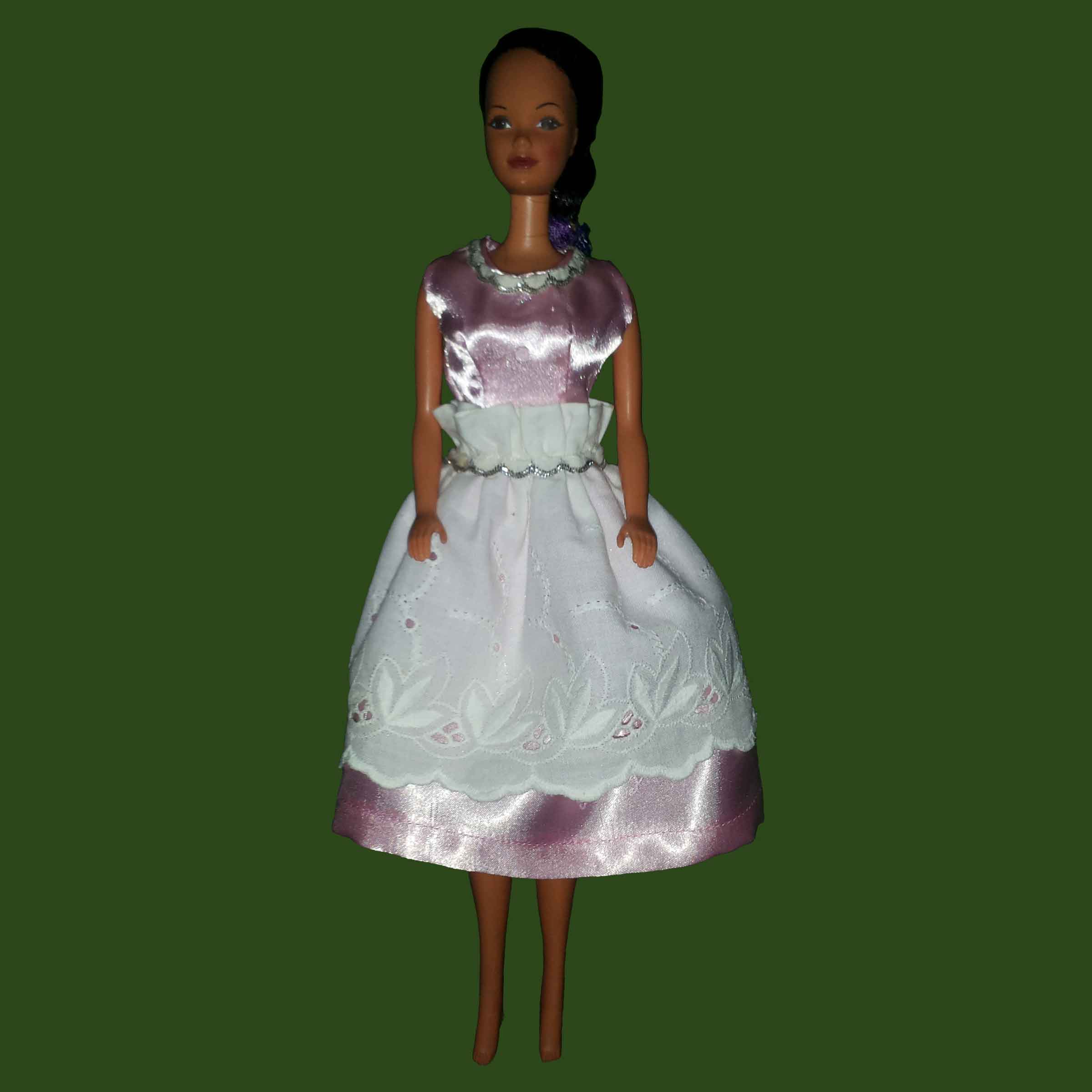 Ref.: BV-2014-0015. Vestido en raso de color rosa con sobre falda de algodón blanco y detalles plateados.