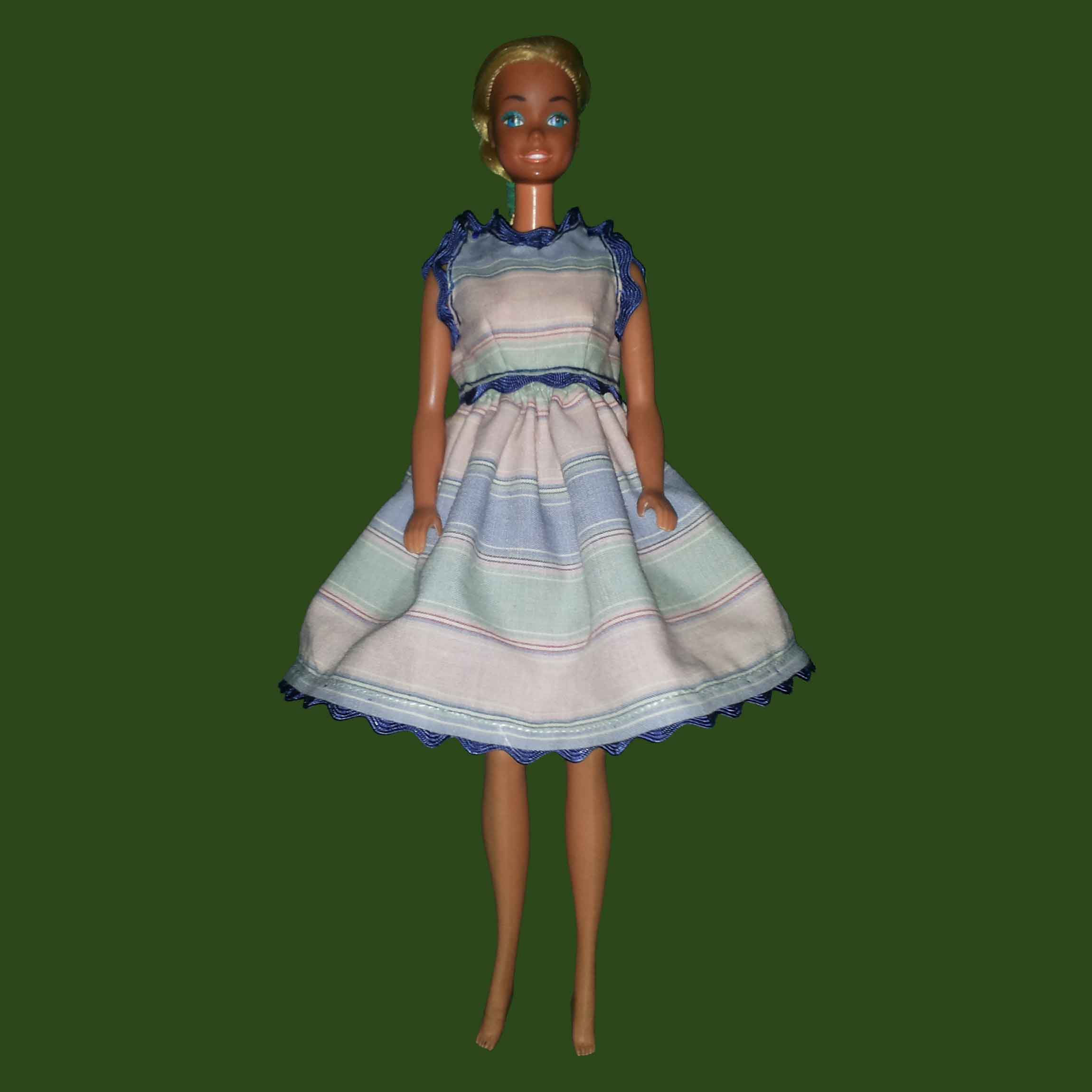 Vestido en algodón estampado a rayas rosa, verde y azul con detalles en color azul.