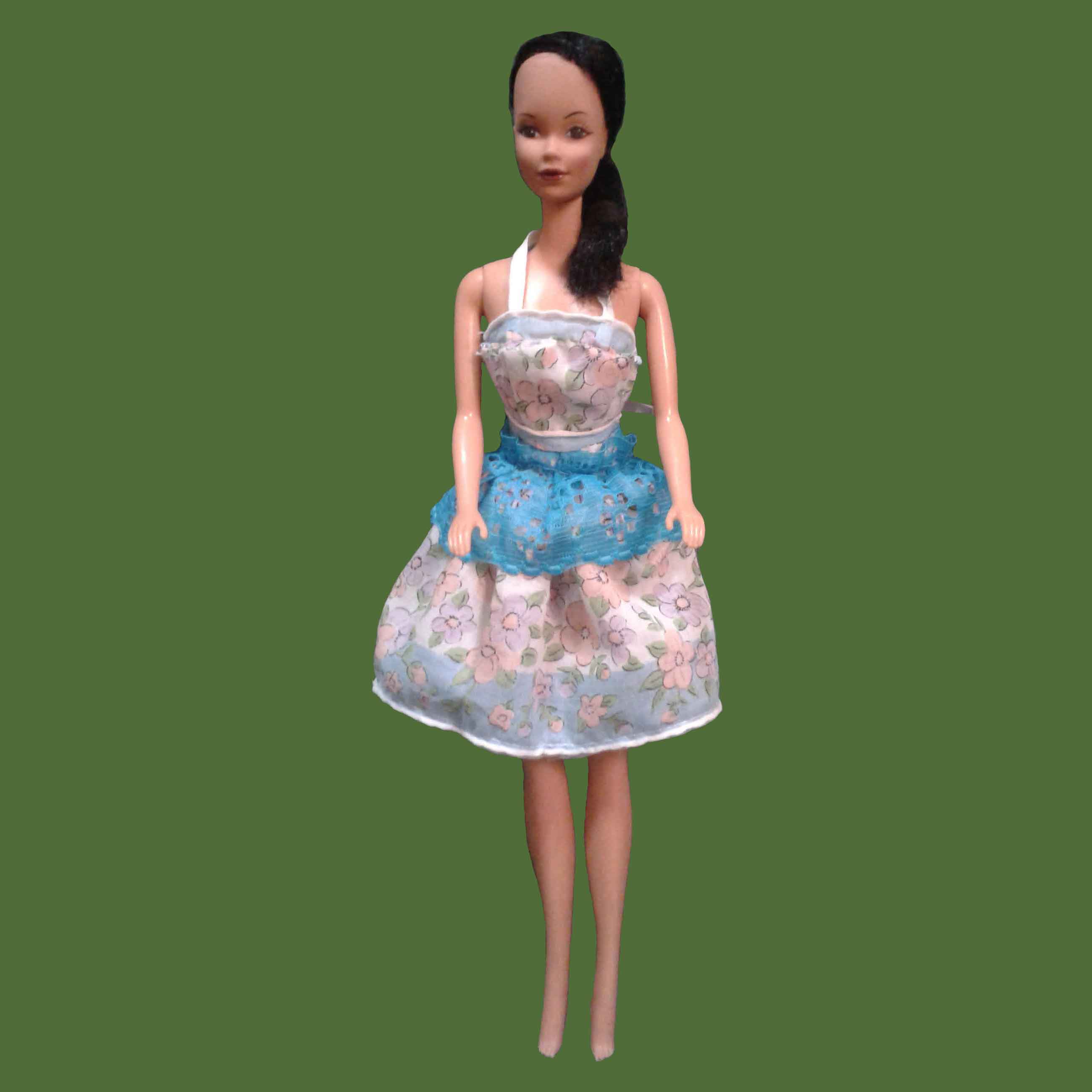 Ref.: BV-2014-0018. Vestido de dos piezas en algodón azul y blanco estampado con motivos florales y detalle en encaje azul.