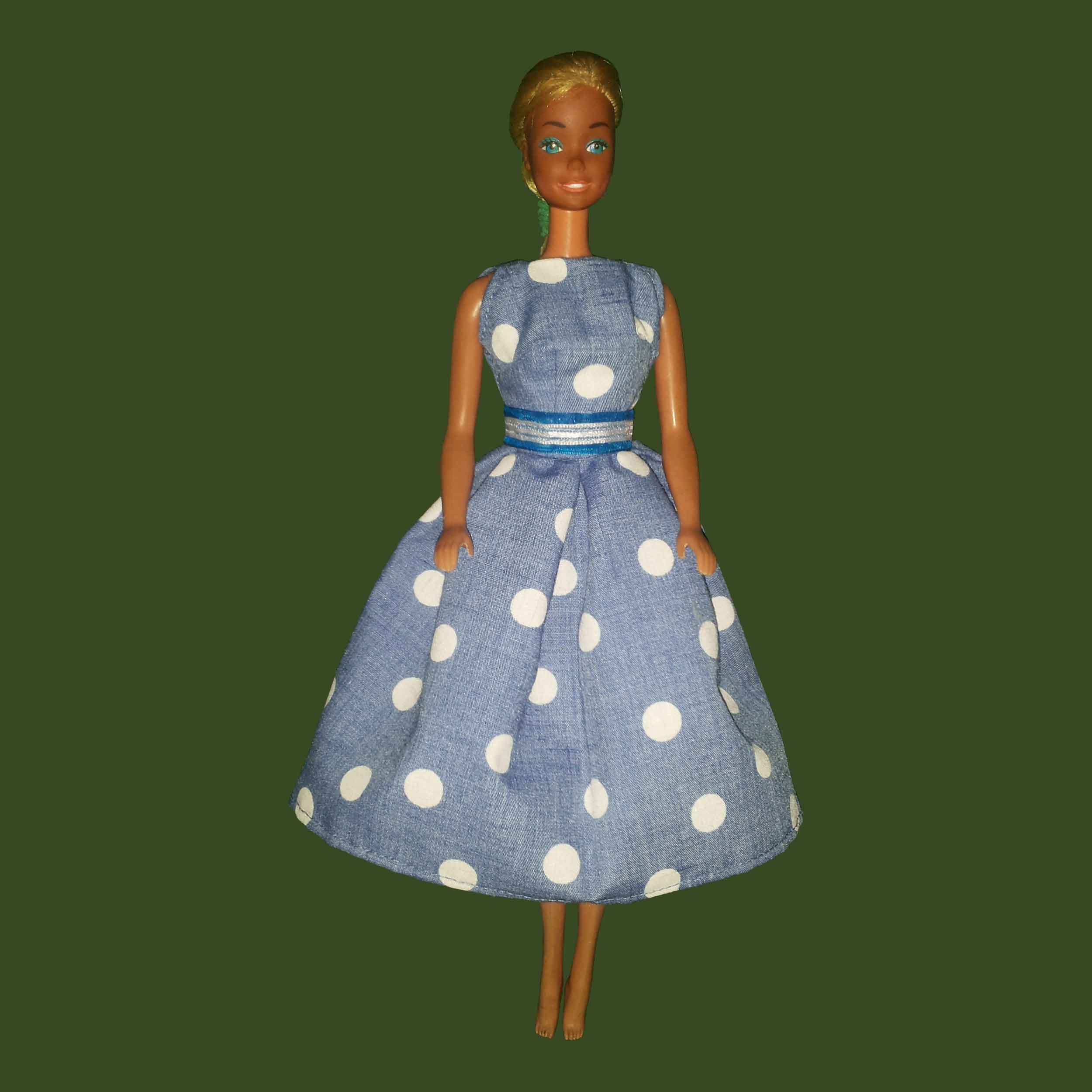 Vestido azul con estampado en lunares blancos acompañado de cinturón.