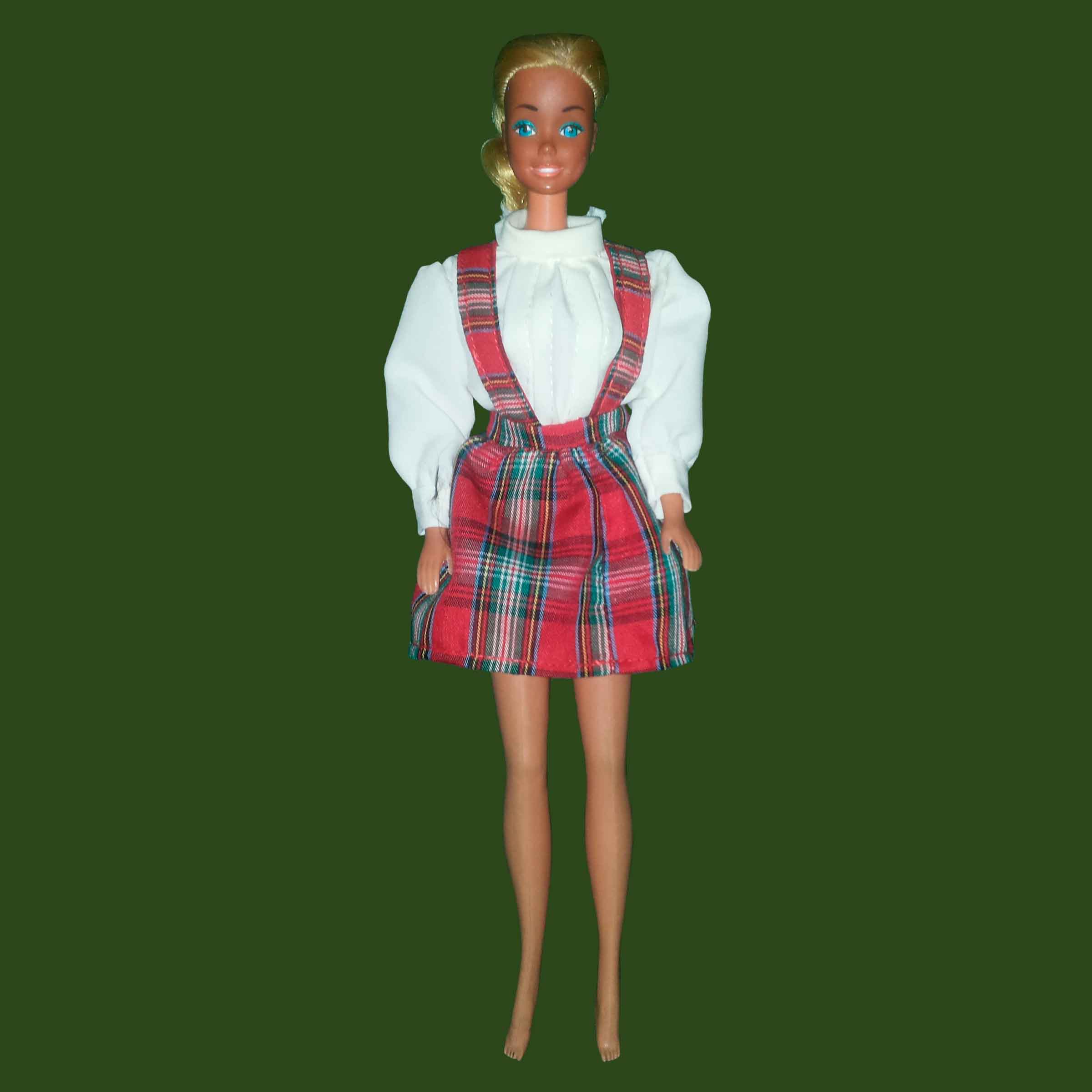 Conjunto de blusa en seda blanco crudo y falda roja en cuadros estilo escocés con tirantes.