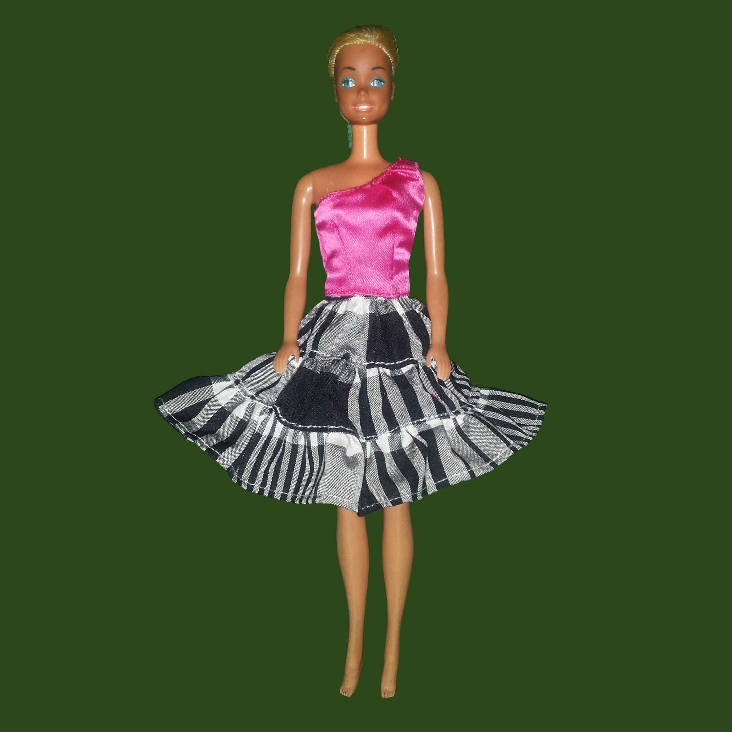 Ref.: BVC-2015-0005. Conjunto de dos piezas con falda en algodón a cuadros y rayas blancas y negras y con top en raso color fucsia.