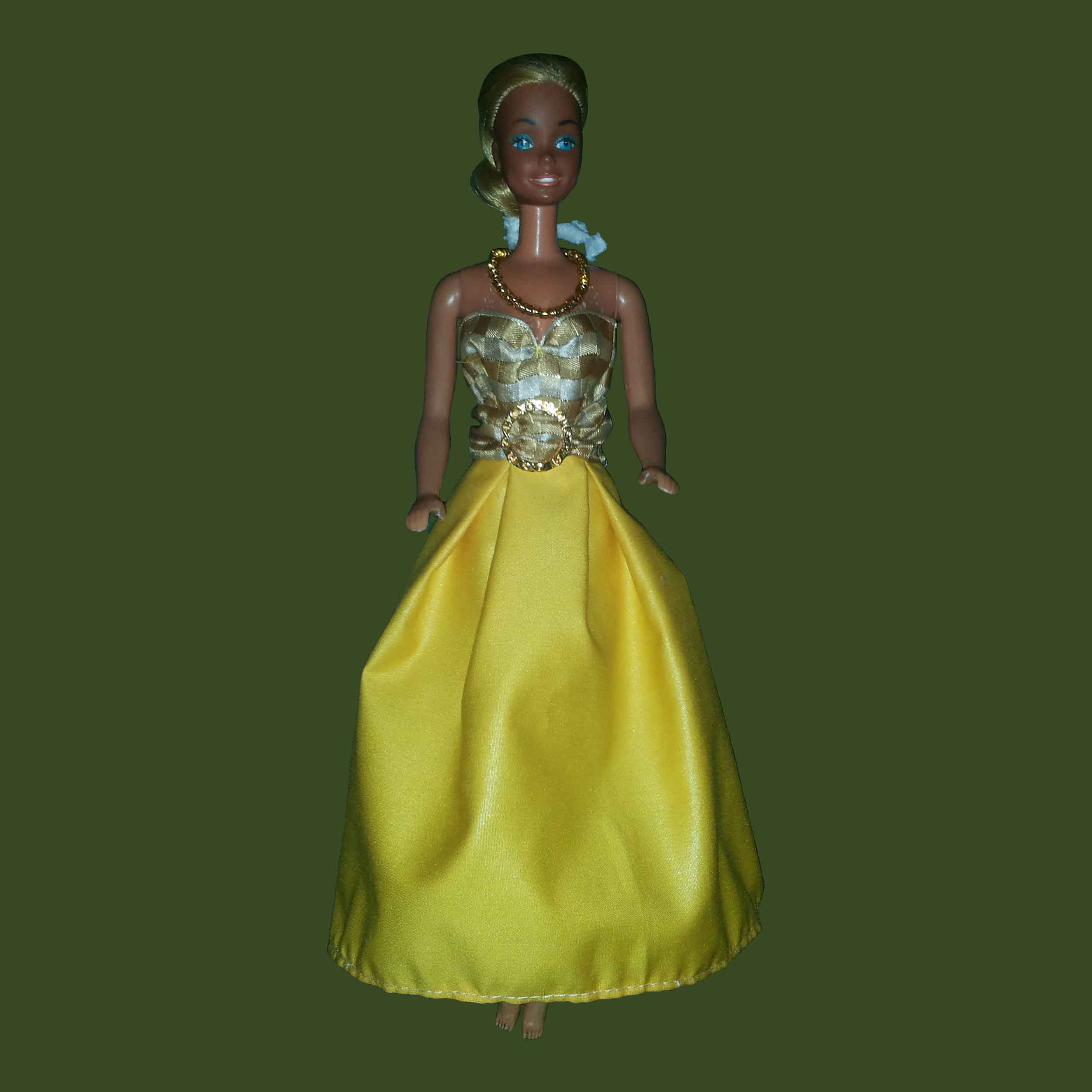 Ref.: BVF-2014-0003. Vestido largo en algodón satinado amarillo con top de raso a cuadros dorado y cinturón a juego.