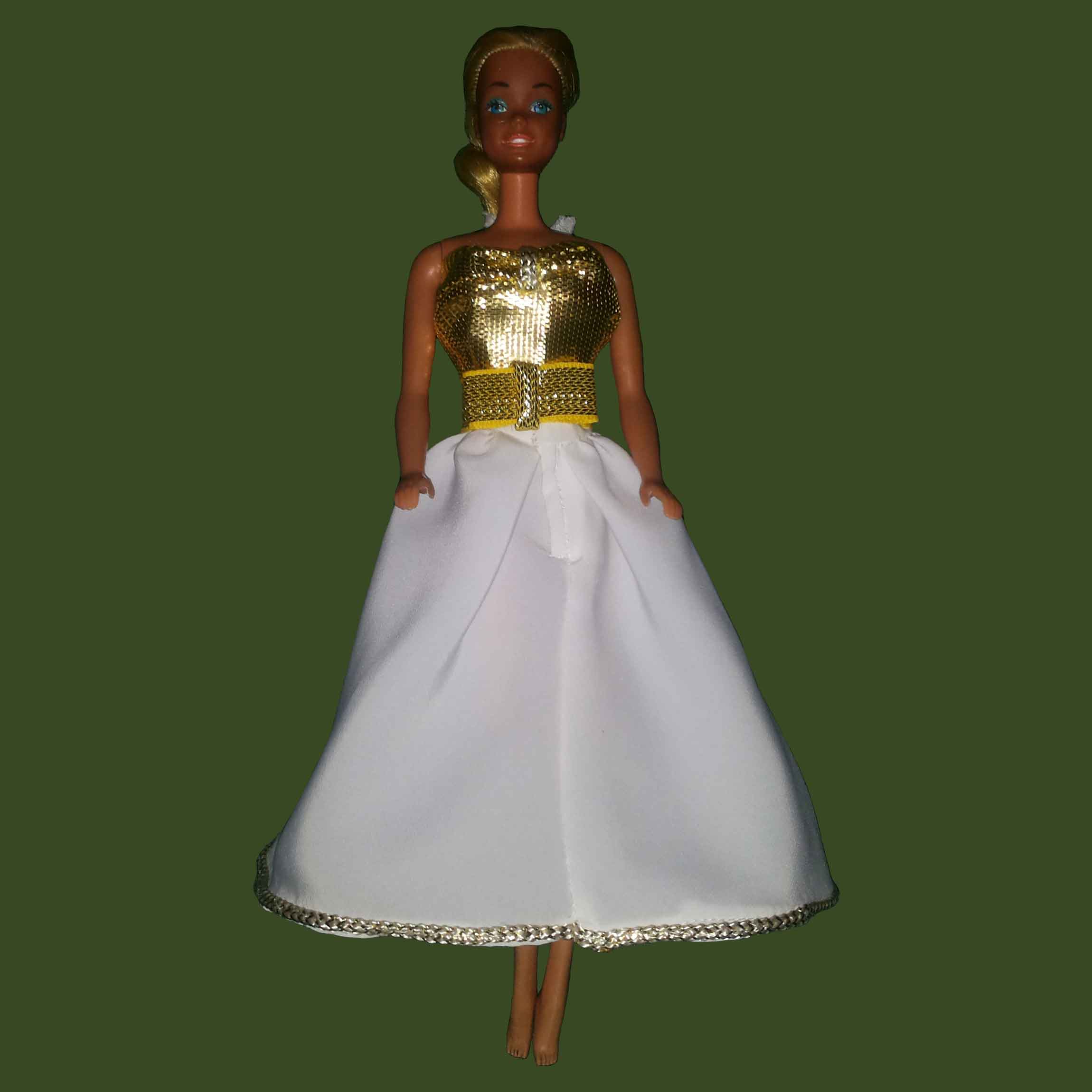 Ref.: BVF-2014-0005. Vestido largo de dos piezas con falda en seda blanca y top en dorado con detalles inferiores y cinturón del mismo color.