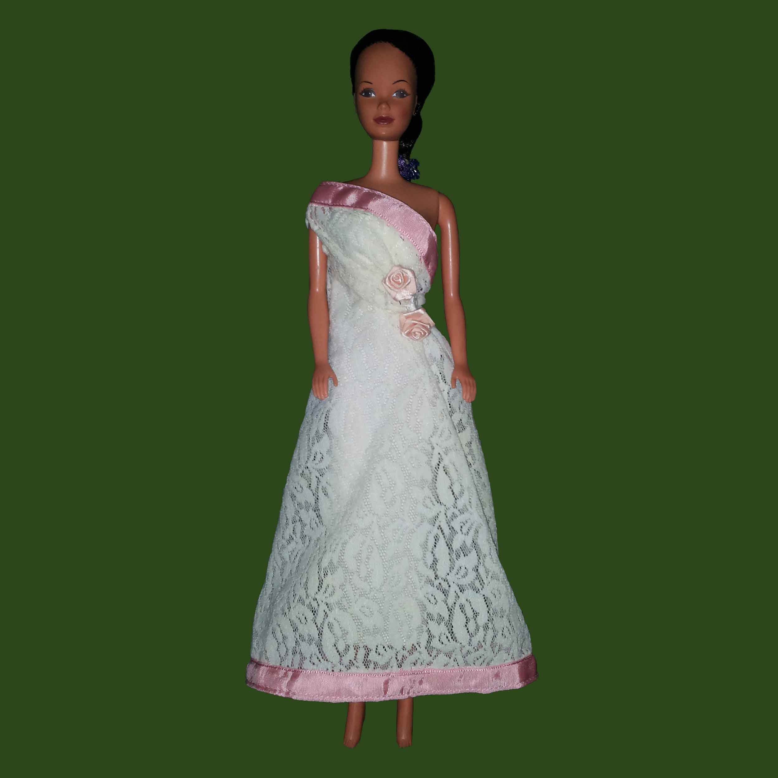 Ref.: BVF-2014-0021. Vestido largo en encaje de lycra blanco con detalles florales en la cintura y color rosa en los bordes.
