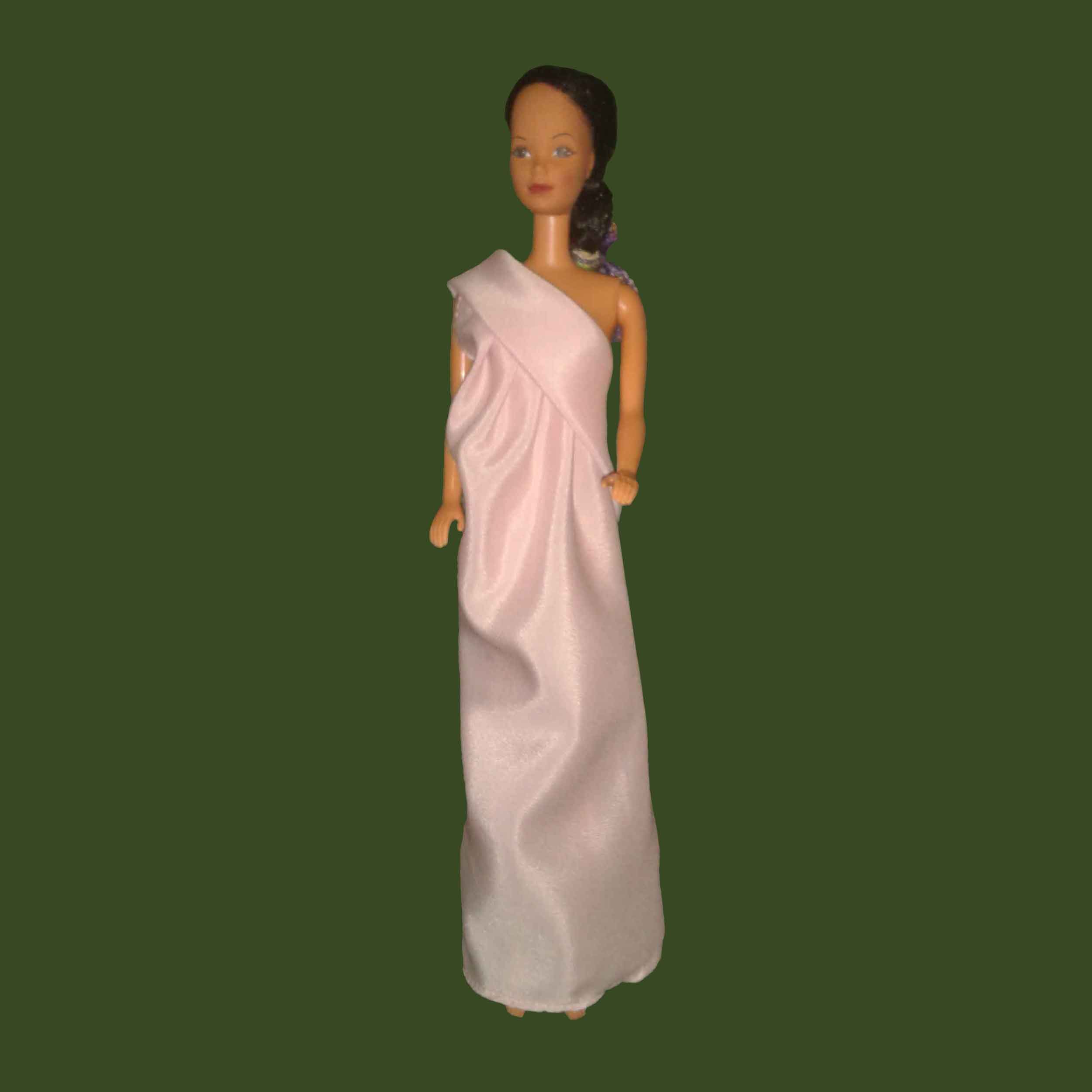 Vestido largo en seda color rosa palo con una sola hombrera.