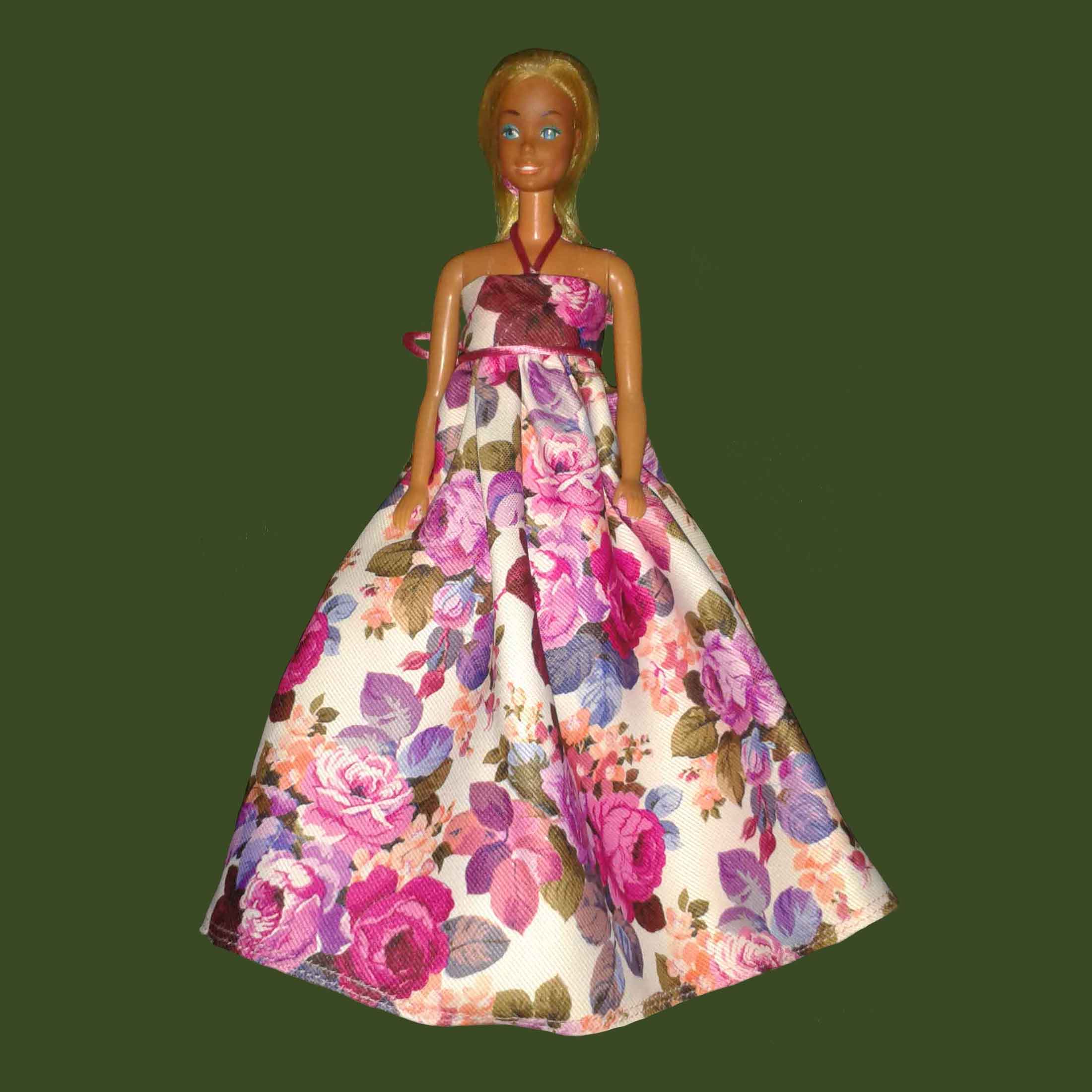 Vestido largo color blanco estilo imperio con estampados florales en rosa, lila y fucsia.