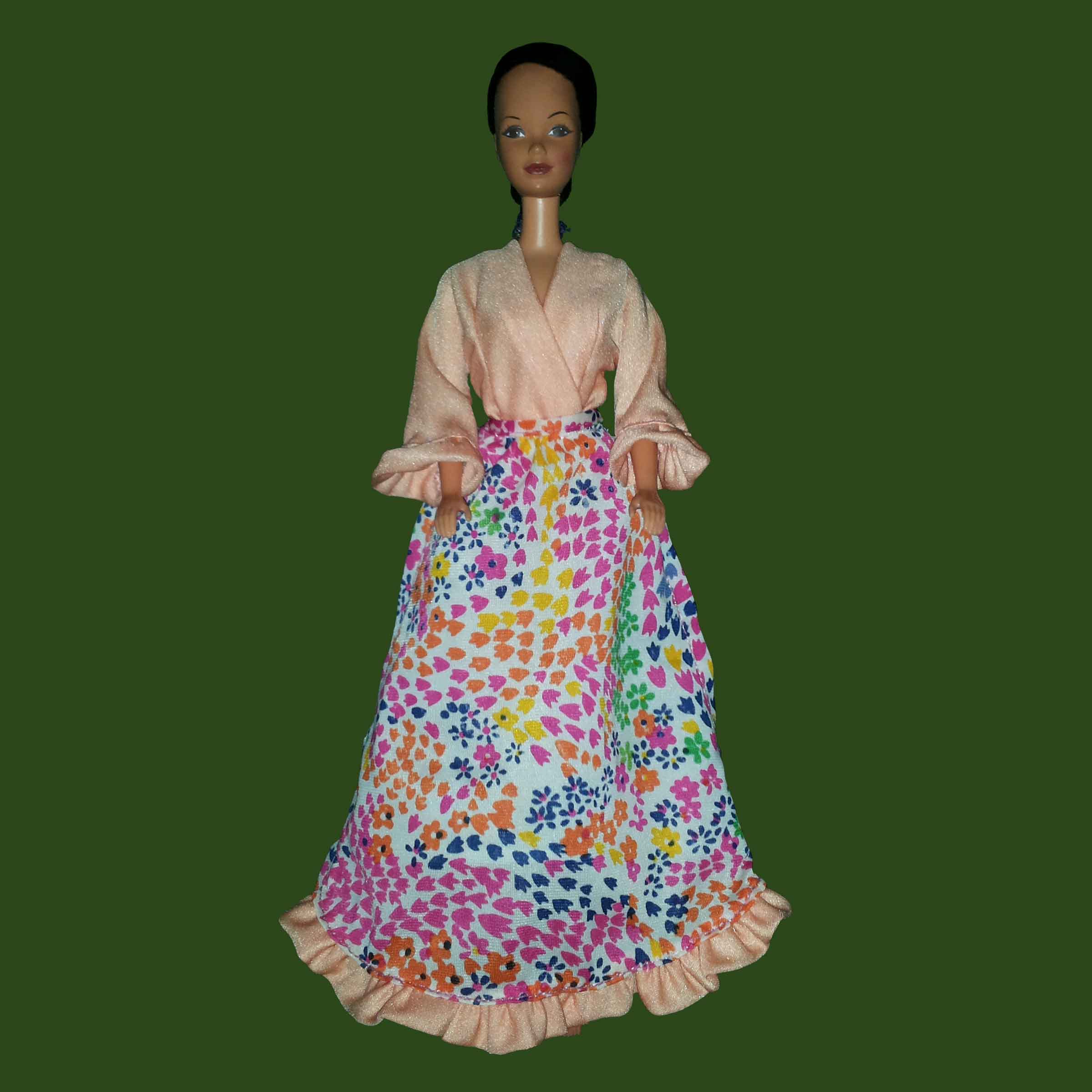 Vestido largo en lycra de color salmón y con estampado con motivos florales.